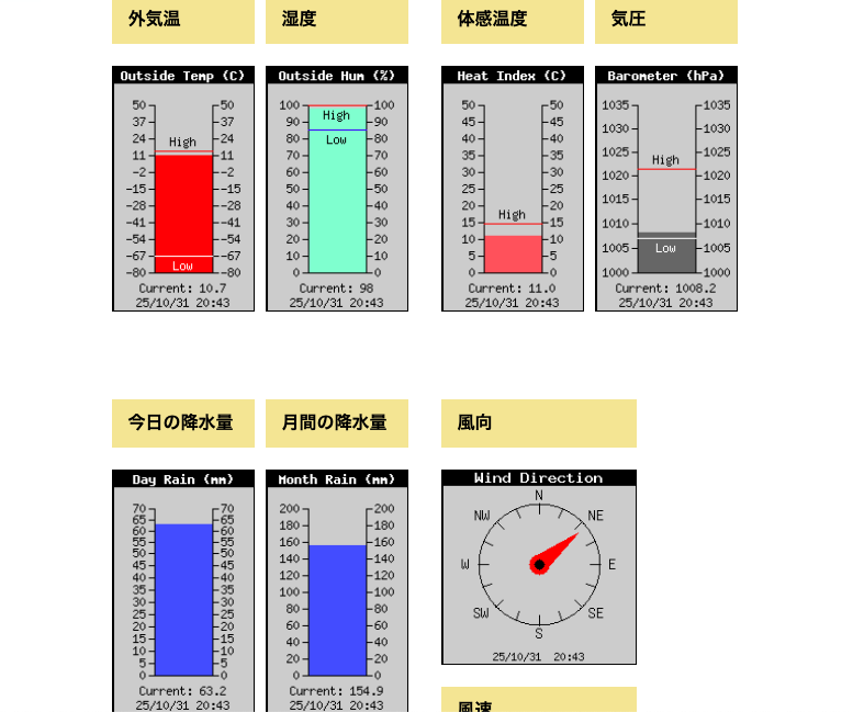 温度、湿度、気圧、雨量、風向・風速といった基本データに加え、体感温度や月間の降水量推移まで可視化。これにより、「今日の農作業をどうするか」「野菜の生育状況にどう影響するか」を、経験と勘だけでなく、確かなデータに基づいて判断できるようになります。